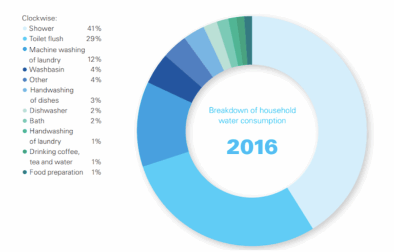 Flushing accounts for 25% of the annual water consumption in an average household, and 43% in offices. A standard toilet’s flush volume is between 6 and 11 liters, which equates to 143 billion liters of clean, drinkable water wasted every day.