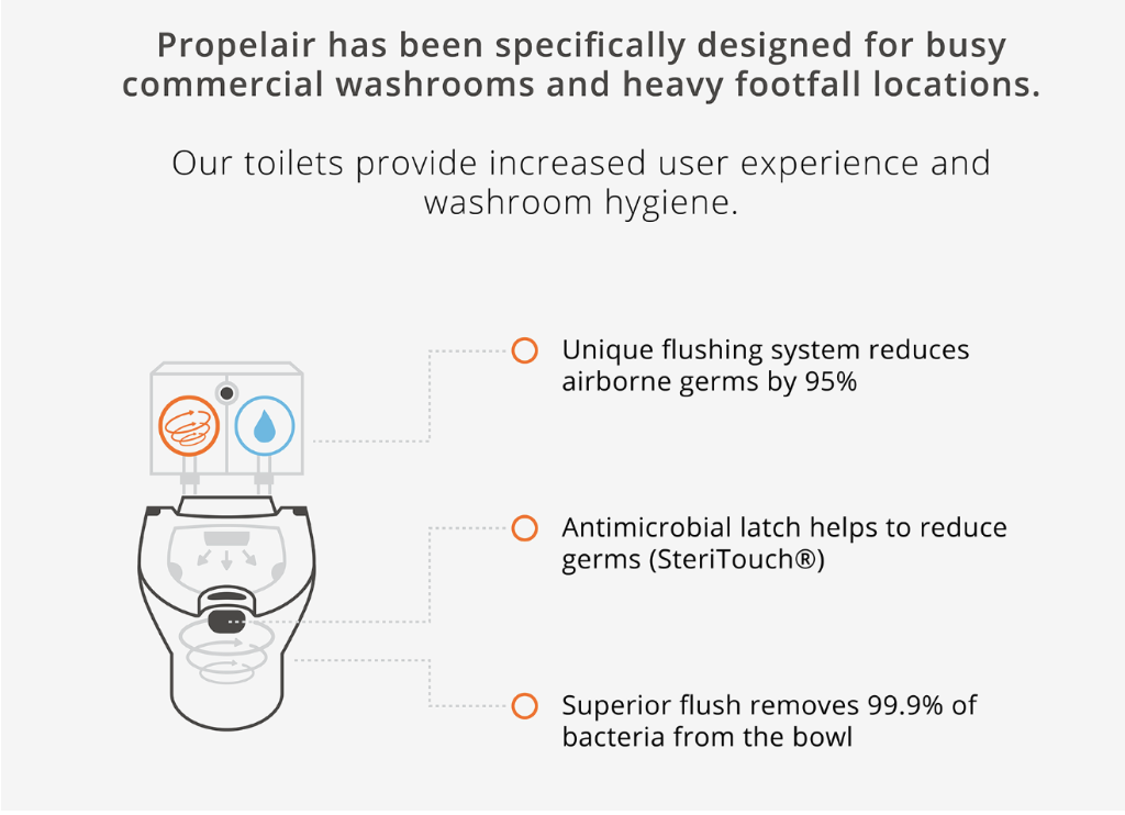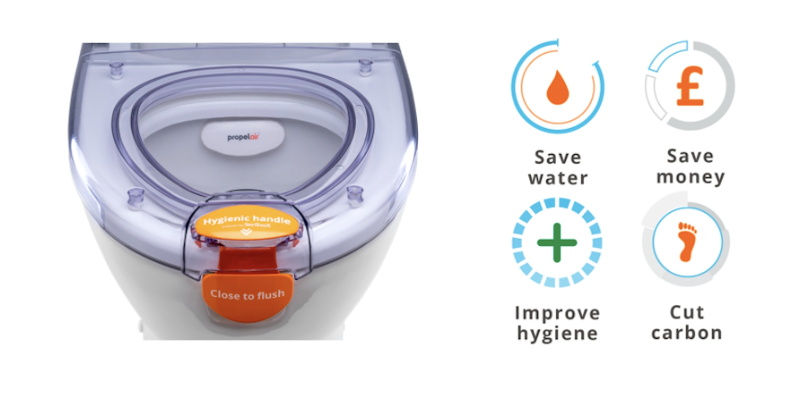 - Propelair aims to be more hygienic than the common toilet, and uses principles such as closed lid flush and antimicrobial materials (Steritouch latch) to design products that will fight the spread of dangerous pathogens, including coronavirus. The latch, in combination with the powerful flushing system, eliminates up to 99.9% water contaminants.