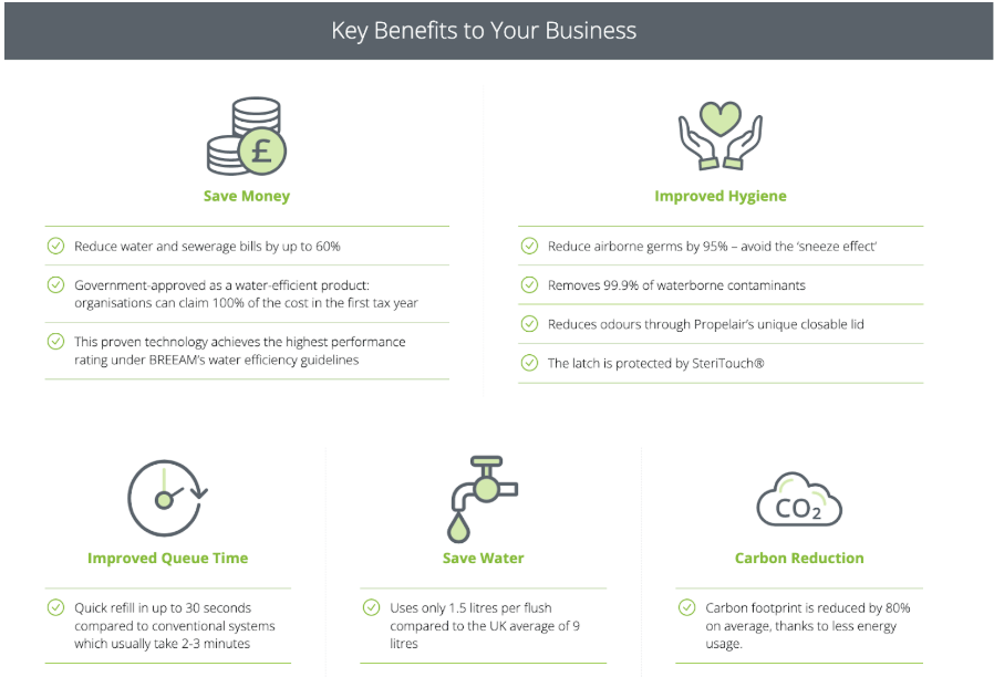 A part of Propelair’s appeal to commercial clients comes from businesses proactively responding to environmental requirements aimed to reduce water consumption. The first one of these new government measures in the UK, for example, will require businesses to add water-efficiency labels to toilets and other appliances by 2025. The Australian government introduced a similar scheme in 2005, and it is projected that it will result in 20% water savings over 25 years, as consumers become better informed about their water consumption and the efficiency of the appliances that they are using.